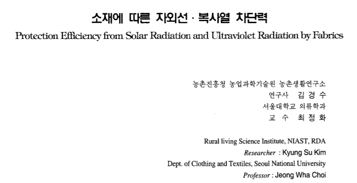 보통 이것과 관련된 내용들을 찾다보면 특정 카페를 만나게 되는 경험을 하게됩니다. 해당 글들은 "소재에 다른 자외선. 복사열 차단력" 이라는 논문을 바탕으로 이야기를 진행하고 있습니다.